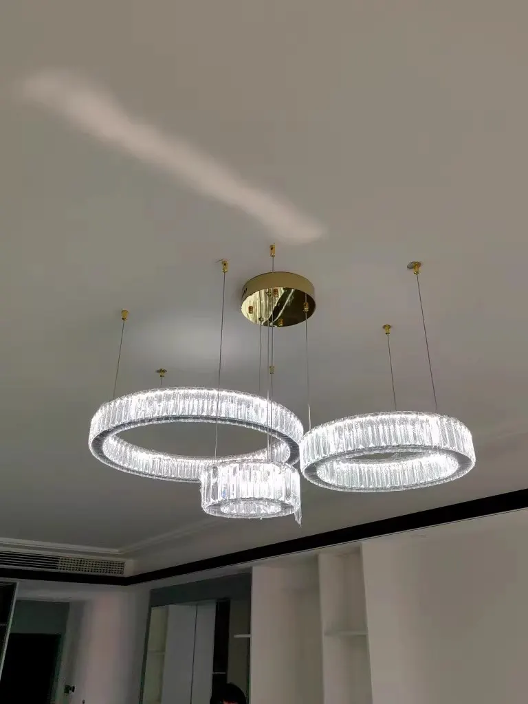 • Sculptural Crystal Ring Architecture: Features precision-cut K9 crystal rings that create a floating "halo" effect, anchoring any contemporary or luxury interior.
